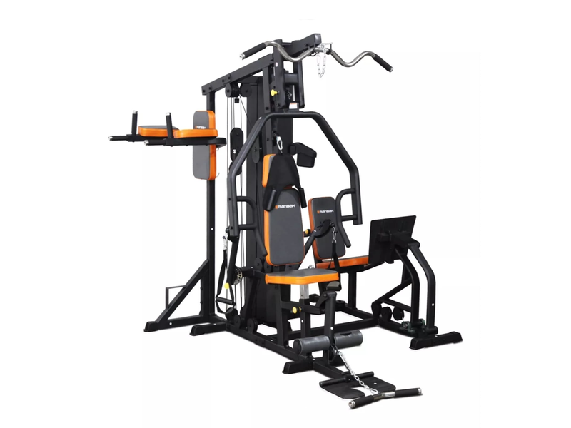 USO: PROFESIONAL PESO MÁXIMO DE USUARIO: 150 KG CARGA: 80 KG (EN LINGOTES, INCLUIDA) EJERCICIOS POSIBLES: DORSALES, PECTORALES, TRÍCEPS, REMO, PIERNAS (INCLUYE PRENSA Y FLEXOR), BÍCEPS, ABDOMINALES. INCLUYE: PRENSA DE PIERNAS, FLEXOR DE PIERNAS